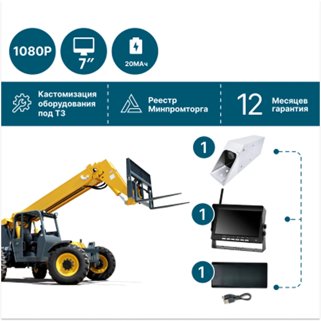 Беспроводной комплект NSCAR AE104 с 2 камерами для погрузчиков. Магнитное крепление, питание от пауэрбанка, монитор 7", защита IP67.